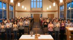 "A diverse/Chinese/Taiwanese congregation in a softly lit, modern yet reverent church setting, lifting up the communion bread and cup. A subtle, glowing aura surrounds the elements in their hands, depicting the transfer of spiritual vitality and physical healing. The atmosphere is filled with hope, deep faith, and peacefulness."
