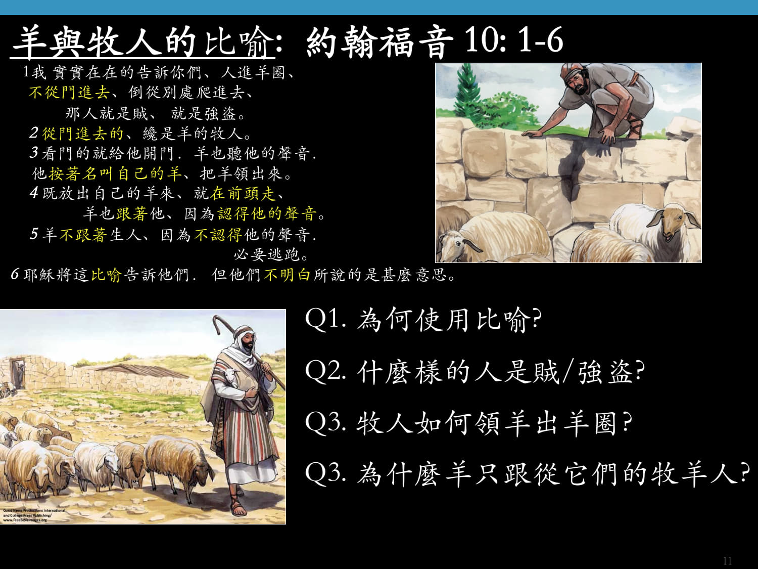 - 羊與牧人的比喻: 約翰福音 10: 1-6(P.11)